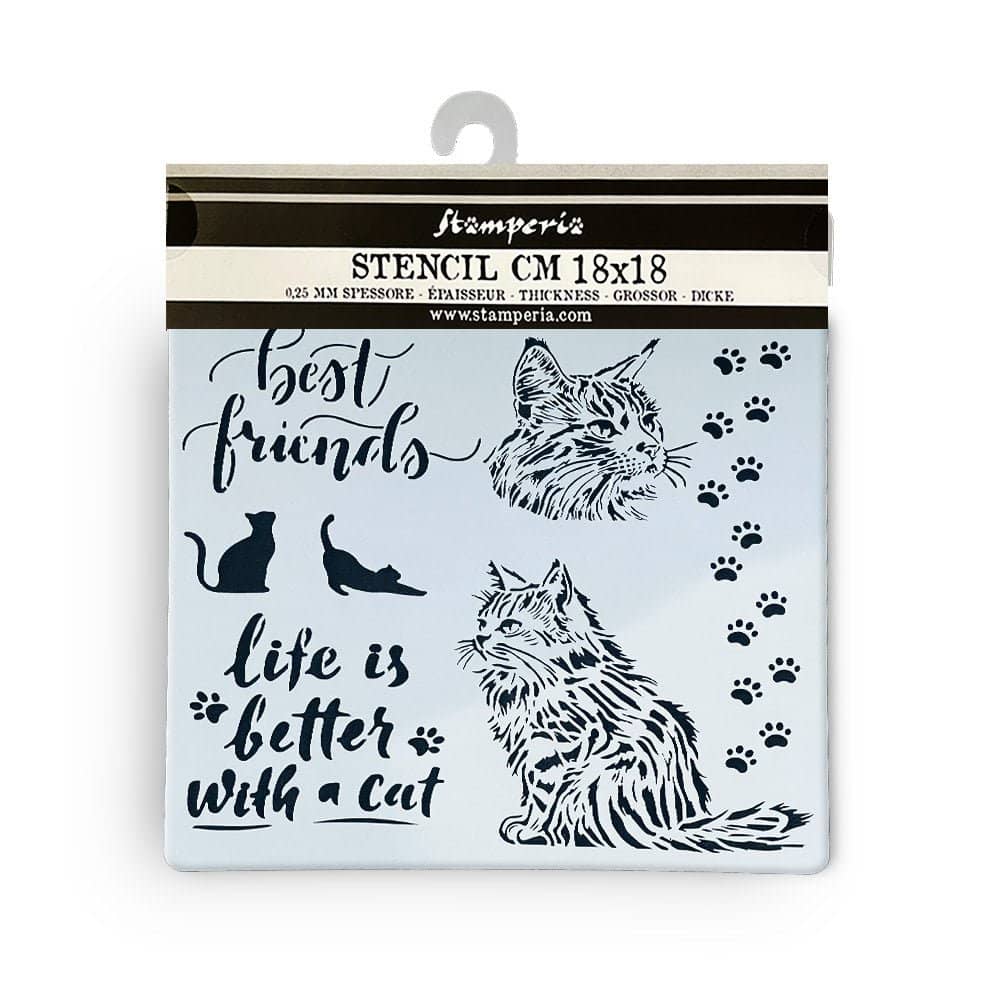 Thick Stencil 18 x 18 cm - Orchids and Cats - Best Friends från Stamperia. Flexibelt och starkt material, 0,25 mm tjock. Stenciler som är idealiska för projekt inom scrapbooking, dekorationer hemma och fin att använda till bakgrunder på uppslag i en Bullet Journal.