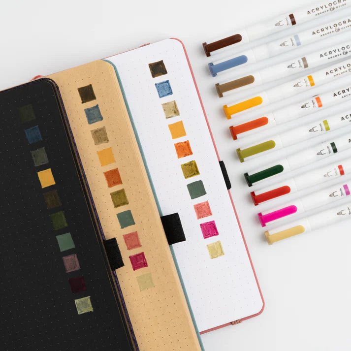 Acrylograph 10-pack 0,7 - Forest Findings från Archer & Olive. Förpackning med heltäckande vattenbaserade akrylpennor som är perfekta att använda på vitt, mörkt och färgat papper. Går att använda lager på lager och att blanda pennors färger. Fiberspetspennor med en fin spets på 0,7 mm.