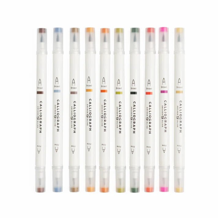 Calliographs Forest Findings - 10-pack från Archer & Olive. Förpackning med vattenbaserade penselpennor med dubbla spetsar. Ena spetsen är Fine - superliten och den andra är Broad - stor. Perfekta för brush lettering, färgläggning och till överstrykningar.