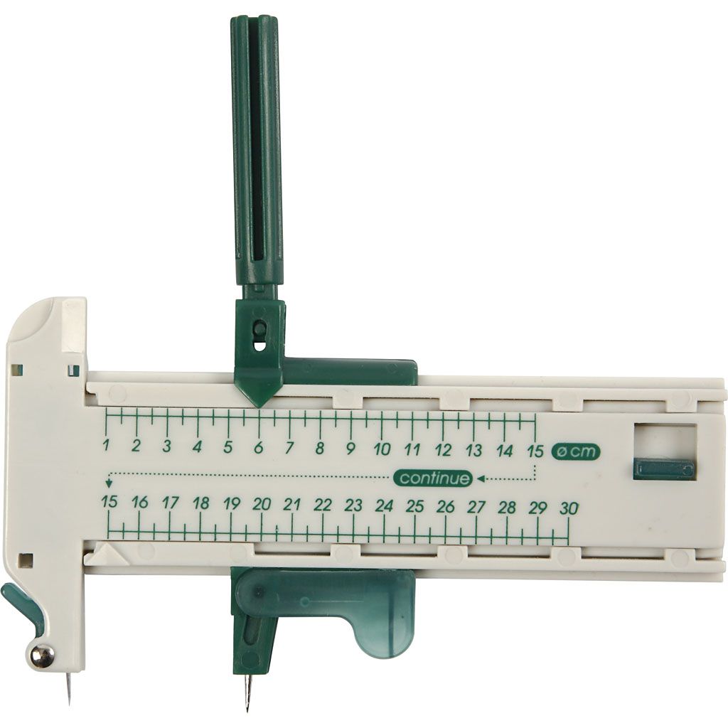Cirkelskärare från Creotime. Cirkelskäraren är i plast med en vass spets (som en passare) och en kniv i metall. Kan skära en diameter på mellan 12 mm och 300 mm.