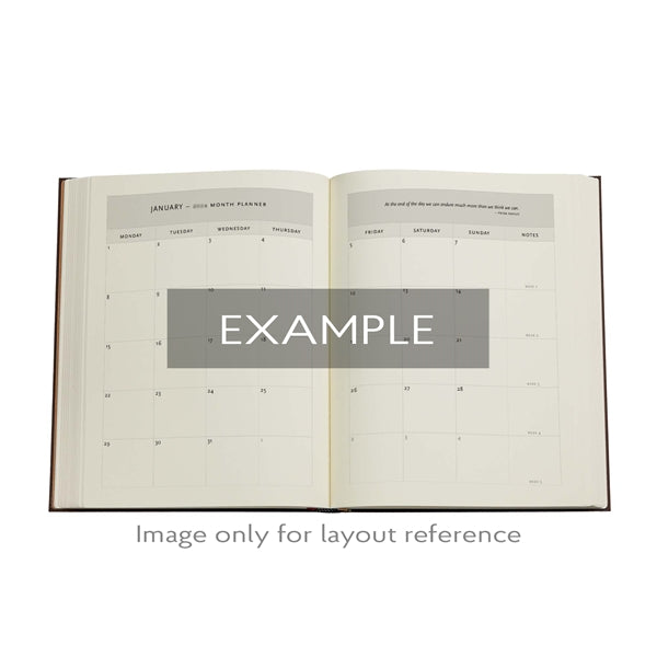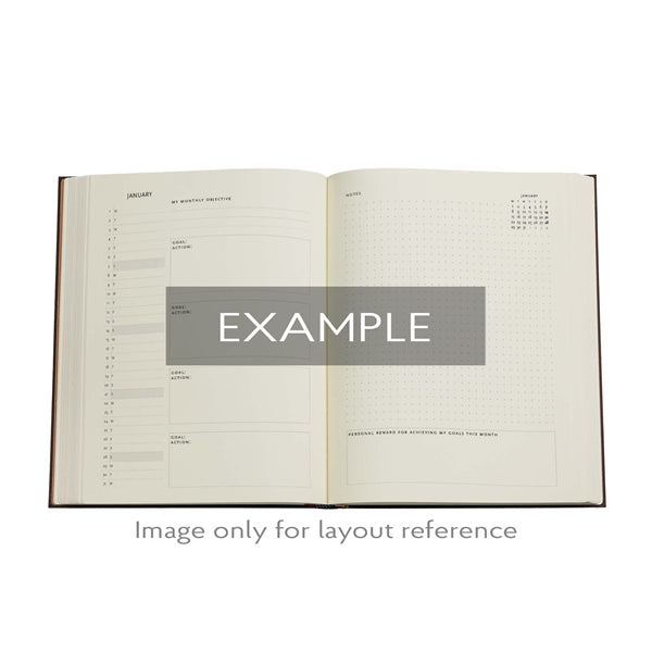 Kalender inleds med en årsöversikt över 2026. Därefter kommer ett uppslag om Intentions och Goals. Sedan finns Månadsöversikter för samtliga månader där du har plats att skriva. Därefter blir det fördjupning över månad där dels dagarna framkommer. Men även Goal - Action och en sida med Notes som är dotted. Därefter rullar det på med veckouppslag med ett vertikalt upplägg med tider 7-20. På varje vecka finns även Goal, Task, Important Follow-ups. Engelsk text.