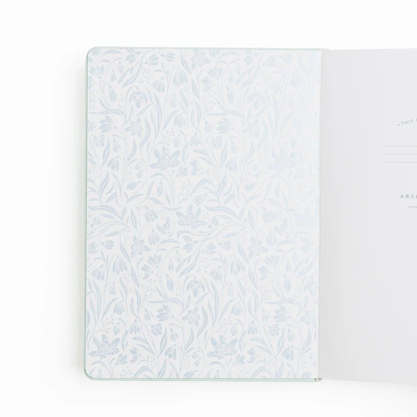 Dotted Notebook Snowdrops Slim från Archer & Olive. Anteckningsbok i ett s.k slimformat med hård textilpärm. Pappret är 160 GSM och det är 5 mm mellan prickar.