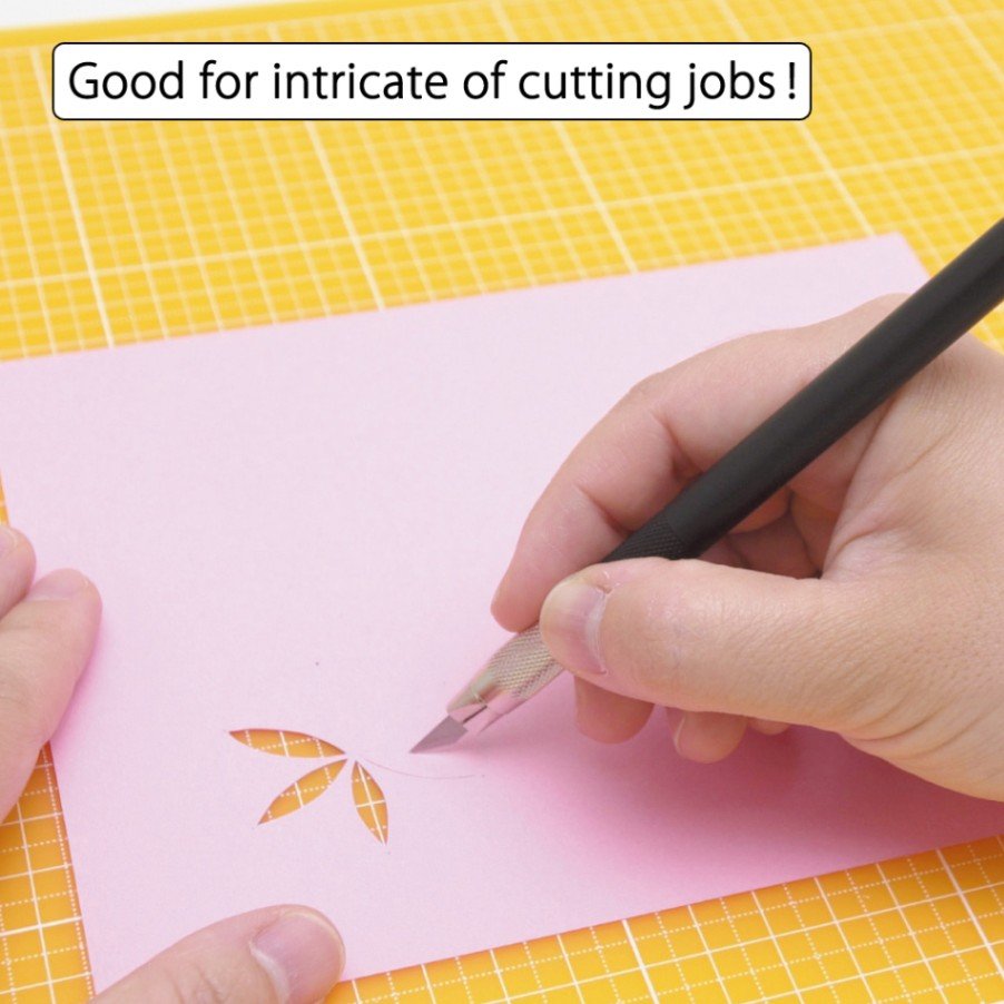 Kniven levereras med 10 blad. 5 vardera av 30gr (BDC-200P) och 45gr (BDA-200P) på blad, anpassat för fin detaljskärning eller robustare snitt. Utformad som en penna, plastkropp och med diameter på 9 mm. Skyddshuva av plast.