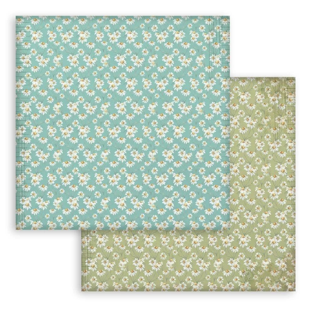 Scrapbookingpapper - Backgrounds - Daisy Art från Stamperia. Förpackning med 10 stycken ark där ark har olika tryck på båda sidor. Pappret är ca 190 GSM. Formatet på arken är 20.3 x 20.3 cm. Syrafritt papper.