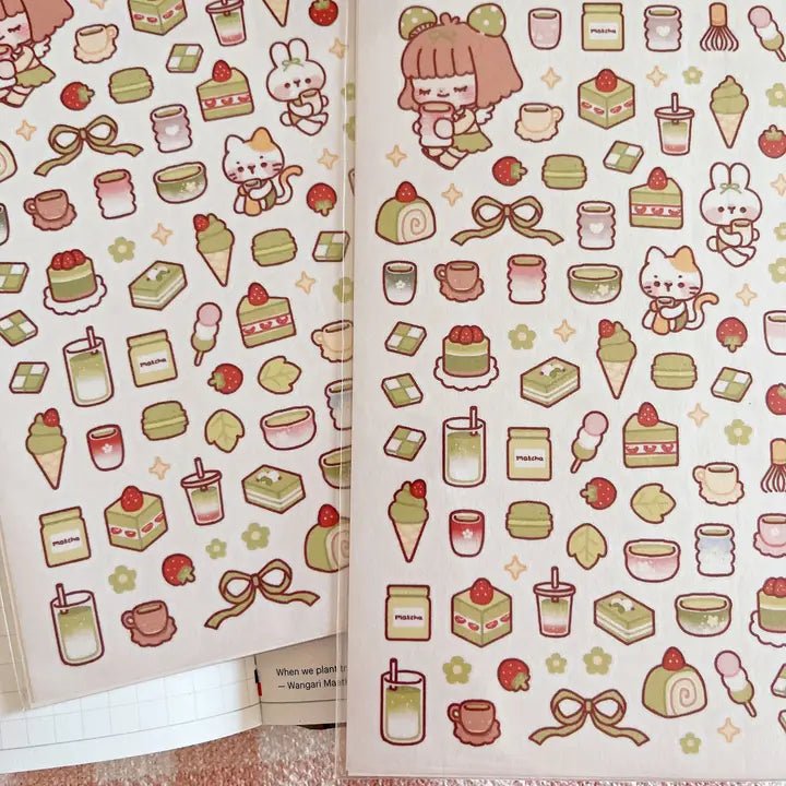 Stickers No. 130 Matcha love från australiensiska Cherry Rabbit. Temat är kawaii-inspirerat. Detta är washi stickers, dvs japanskt papper.
