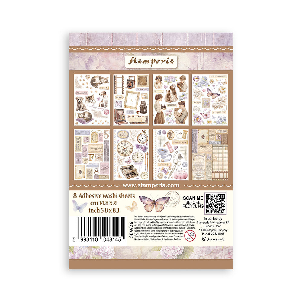 Washi pad - Quiet Days från Stamperia. En förpackning med 8 stycken ark där du själv klipper ut motivet. Det är klistermärken i tunt washi-material och storleken på arken är i A5, 14,8 x 21 cm.