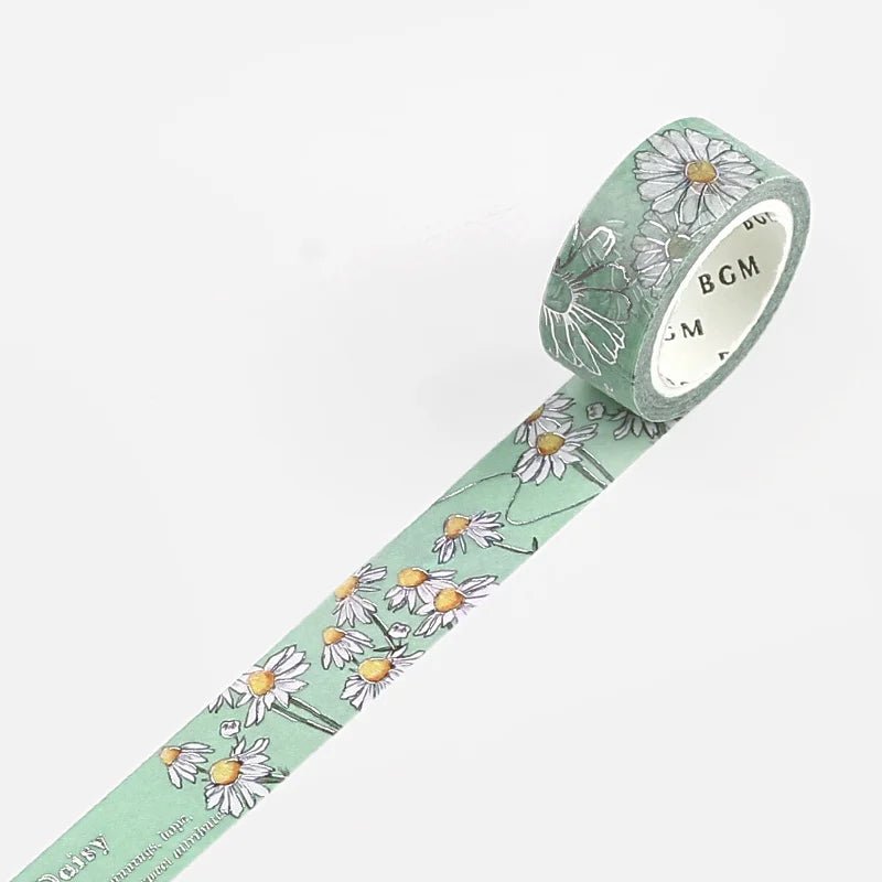 Washi Tape Blossom - Sky Green från BGM. Blossom är en serie med fina blommor. Det finns även detaljer i metallic. Vacker att använda till dekoration och pyssel och en läcker detalj i en Bullet Journal. 15 mm bred och 5 meter tejp.