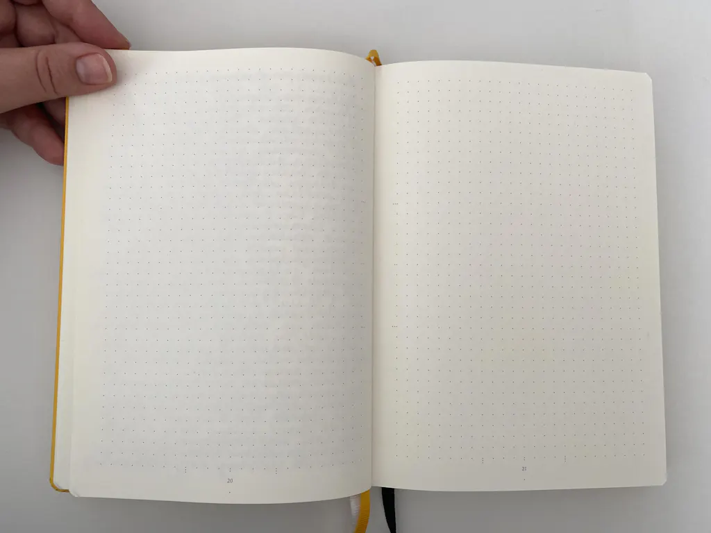 The notebooks are dotted, i.e. have dotted pages. It is a hard cover with an elastic band around, three marking strips and an inner pocket at the back. The book is wire bound, the pages are numbered and the paper is 120 GSM, thicker paper than the other books from Leuchtturm1917.