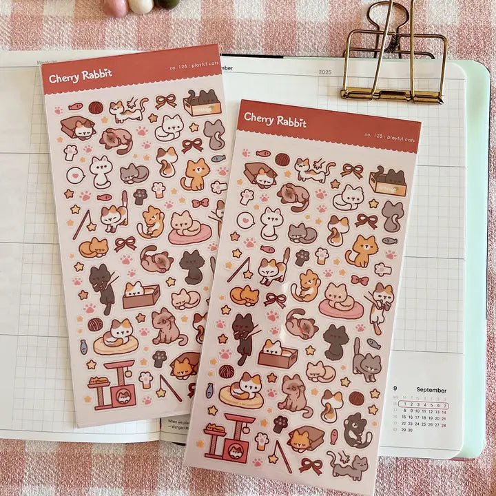 Stickers No. 128 Playful cats from Australian Cherry Rabbit . The theme is kawaii-inspired. These are stickers in PET, transparent plastic.