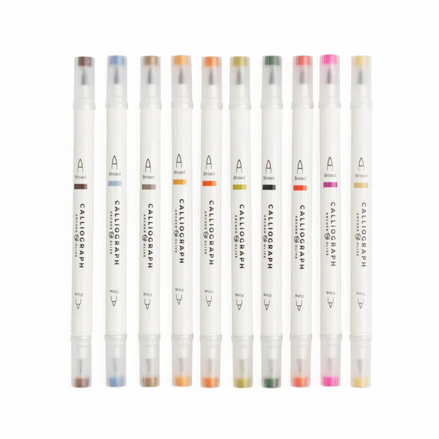 Calliographs Forest Findings - 10-pack from Archer & Olive . Pack of water-based brush pens with dual tips. One tip is Fine - super small and the other is Broad - large. Perfect for brush lettering , coloring and for highlighting.