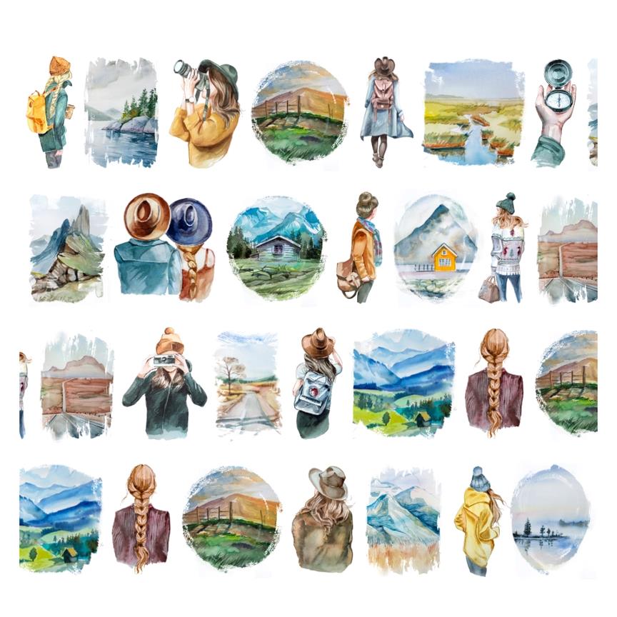 Pre cut Pet Tape - Penpaling Paula - Nomad 60 mm, decorative tape with a travel theme. It is stickers on a roll with a cut-out round motif, transparent plastic. The roll is 6 cm wide and there are 5 meters on the roll.