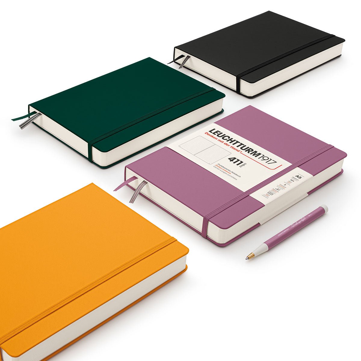 There are 411 numbered pages and there is a table of contents. The notebook is wire-bound, there is a marking ribbon and an elastic band for closure. The paper is acid-free and FSC-certified. The format is A5 with dimensions of 14.8 x 20.8 cm. Stickers for marking and archiving are included.