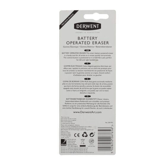 Battery-powered eraser from Derwent . Eraser that is good for efficient and precise erasing. 8 refills included, refills available for purchase. Requires two AAA batteries (not included).