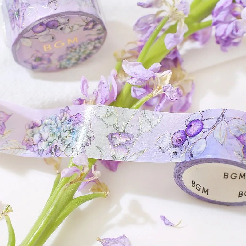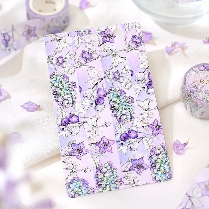 Washi tape Margin - Purple from BGM. The theme is a purple background with beautiful flowers on it. There are nice details in metallic. It is 20 mm wide and there are 5 meters on the roll.