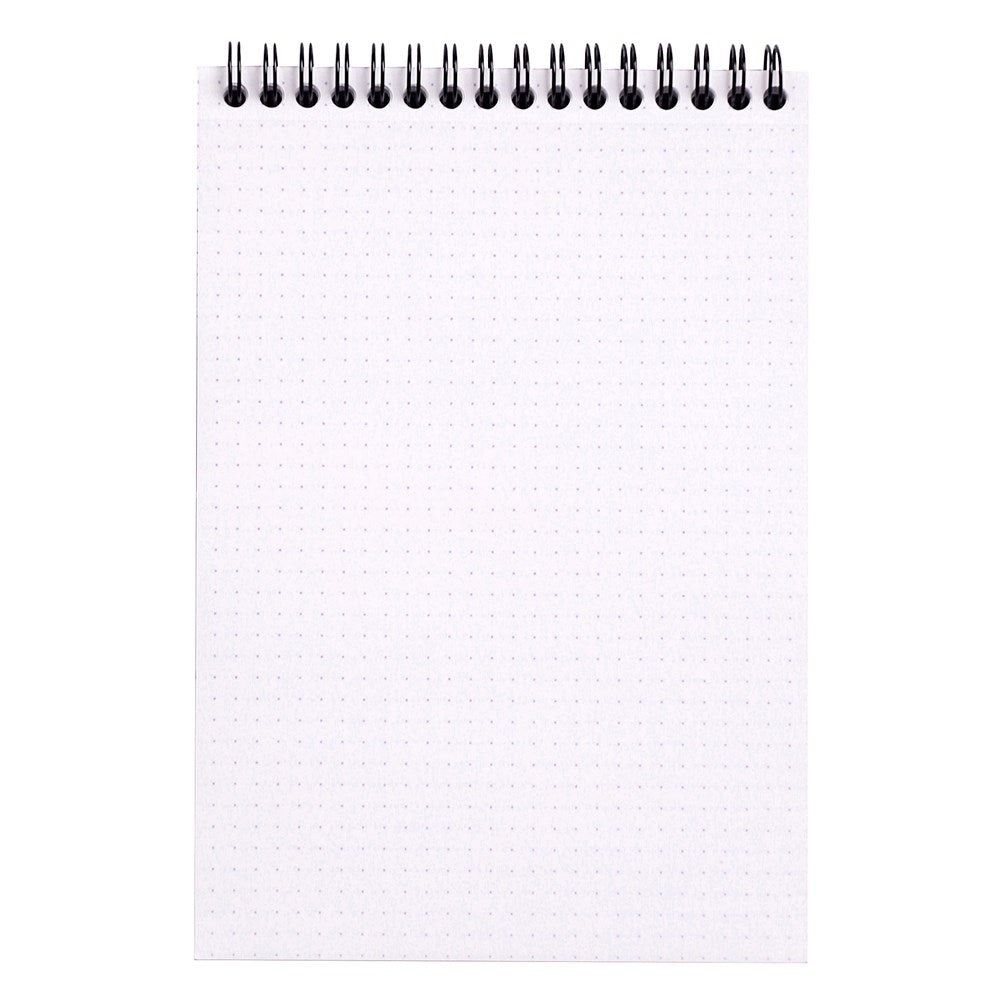 Spiral notebook that is dotted in A5+ format, spiral on top. The notebook is good as a notebook, at school, in the office and at home. A joy to write on.